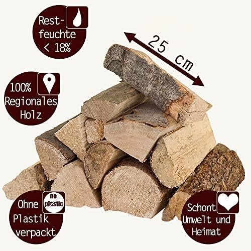 100 % QUALITÉ : Ce bois de chauffage (25 cm) est séché au four (c’est-à-dire sec), prêt à enfourner et a une humidité résiduelle inférieure à 18 %. Le bois provient de forêts régionales allemandes. Dès l’ouverture du coffret, vous serez émerveillé par l’odeur du bois. Ce bois de chauffage est également un accroche-regard comme décoration ou bien empilé dans le panier à bois. Le mélange de bois de chauffage se compose d’env. 60 % de bois dur comme le hêtre, le chêne et le bouleau et env. 40 % de résineux comme le pin et l’épicéa. UTILISATION : En raison du mélange des différents types de bois et de leur comportement de combustion différent, vous n’avez pas besoin de bois de chauffage supplémentaire. Vous avez maintenant toujours le bon bois à portée de main pour fumer, même si vous souhaitez changer le goût à court terme.